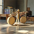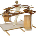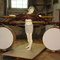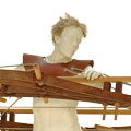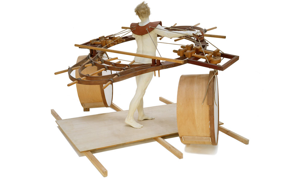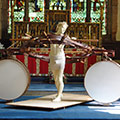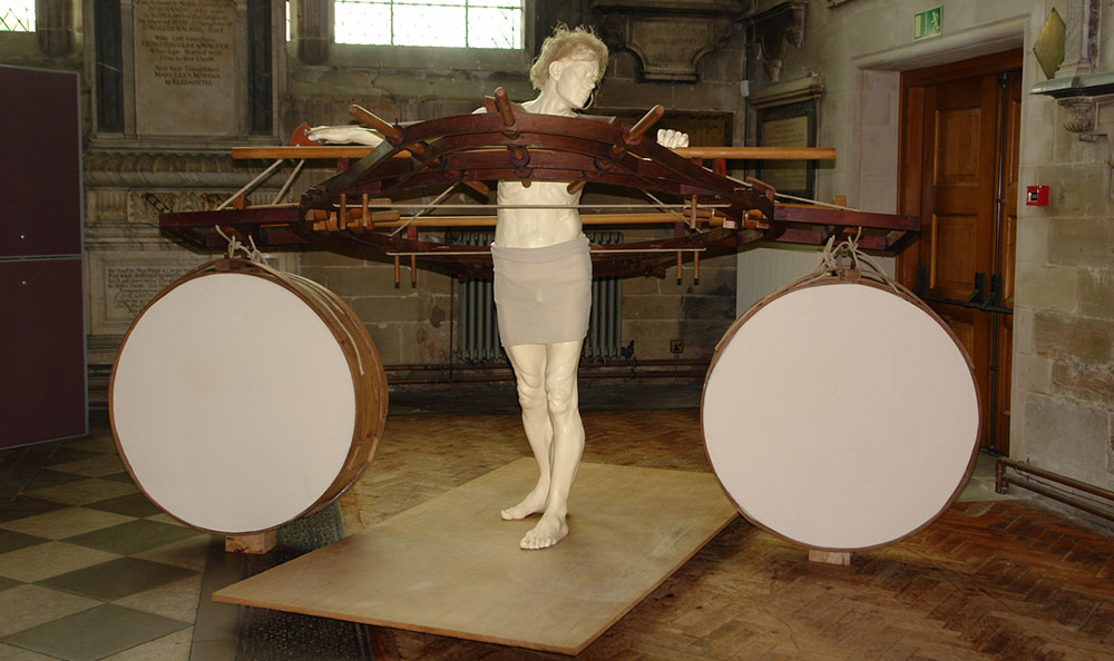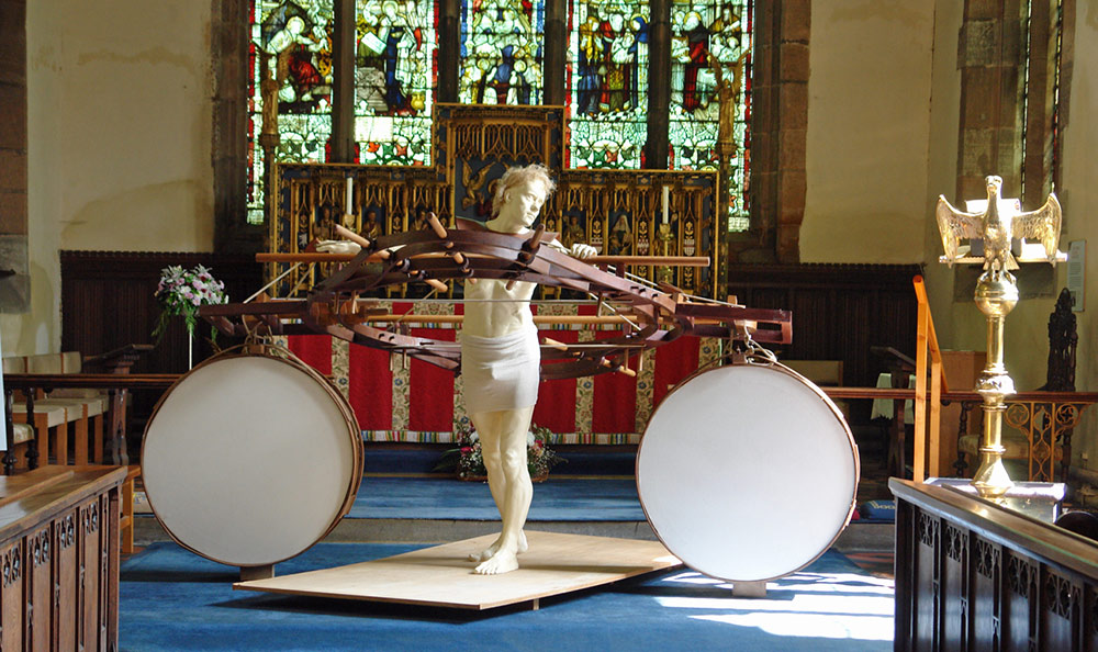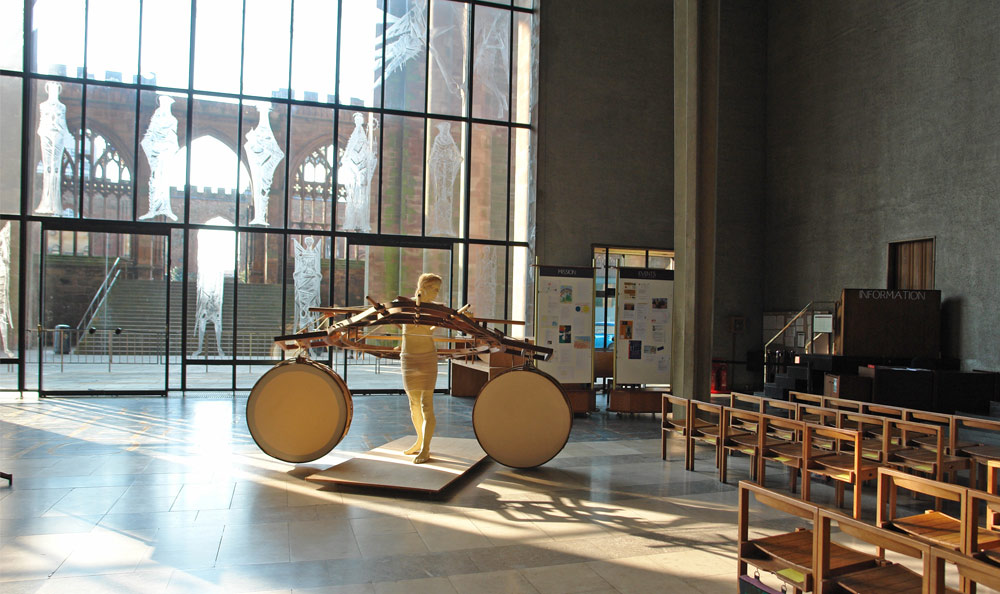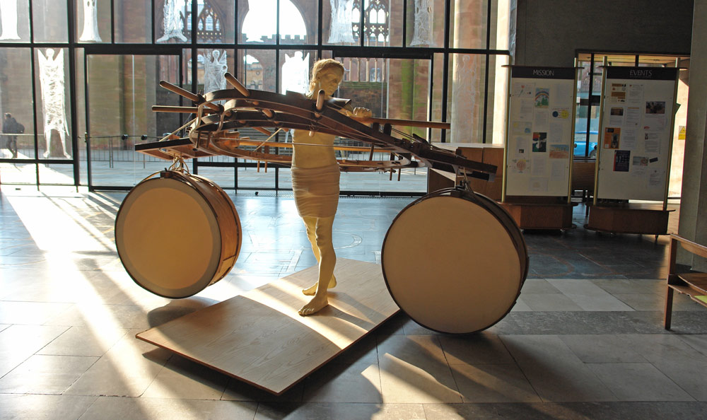 I wished to convey to the viewer the figure sculpture as an intercessory angel between those still alive amongst the destruction, and the terror raining down from the aircraft overhead. The ascending angle of the apparatus from rear to forward of the figure, and oblong attachments to the assembly either side of the figure sculpture, suggests a primitive flying apparatus not capable of actual, but of symbolic flight. The huge circular drums, I imagine as voices of the vanquished. The neutrality of this work enables us here to reflect on the earlier and comparable mass bombing of the medieval city of Coventry in November 1940. The piece reminds us of the effort to peace and reconciliation Coventry Cathedral has sought with Dresden and to subsequent spheres of conflict since the very end of the Second World War.